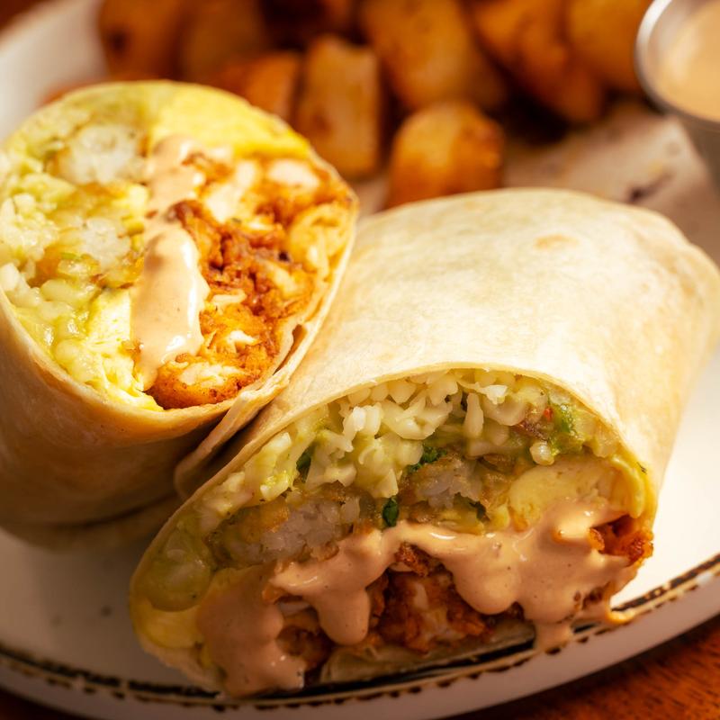 Fried chicken breast, sunnyside eggs, tater tots, pepperjack, guacamole, chipotle aioli, in a flour tortilla, served with brown butter potatoes